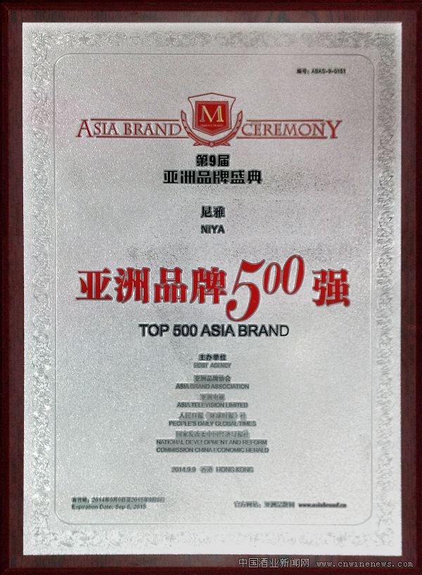 日前,有著亞洲品牌界年度“奧斯卡”美譽的第9屆“亞洲品牌盛典”在香港隆重召開。本次盛典星光熠熠,金融、房產、家居、食品、能源等多個行業的佼佼者齊聚一堂。中信國安葡萄酒業(股票代碼:600084)旗下尼雅葡萄酒憑借卓越品質和強大的品牌影響力再次位列“亞洲品牌500強排行榜”之列,又一次向世人展文章來源中國酒業新聞網示了國產葡萄酒的強大實力和品牌價值。