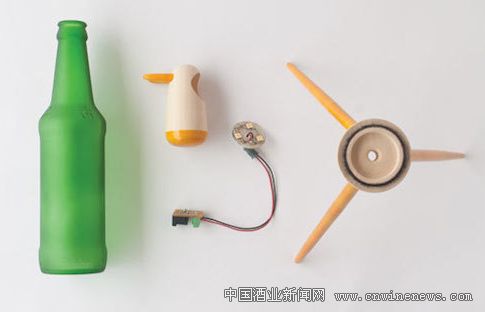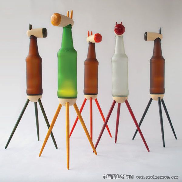 設(shè)計師把廢酒瓶當(dāng)做動物的身體,然后加上三角底座、頭等零件,接著再加入 LED 光源、電池和開關(guān),將其變成臺燈。此外設(shè)計師還聯(lián)手印度當(dāng)?shù)氐氖止に囌撸瑢Σ煌煨偷木破窟M行了深度加工和改造,通過蟲膠將切削好的木制零件固定到瓶子上,做出更加憨態(tài)可掬的動物臺燈。