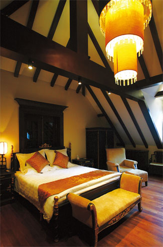 主樓的三層樓面共22 間客房,一樓為雙人標準房,二樓是豪華行政房,三樓則利用挑高優勢打造出5套構造別致的復式套房。雖然房間分類不同,一脈相承的卻是濃郁的中式味道,這種味道從推開門的一剎那就撲面而來,那畫面也許是一張巨大的仿古頂箱立柜,也許是如華蓋般散發著貴氣的頂燈,也許是欲遮還羞的那一層紫紅色紗幔,總之能把你瞬間拉到一片懷舊的思緒里。