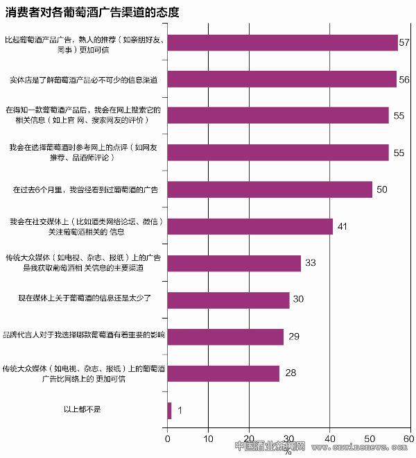 然而,談及葡萄酒行業,網購葡萄酒的滲透率遠不及平均水平:僅有四分之一的生活在一、二、三線城市的消費者表示,到2014年8月之前的6個月內,曾通過線上渠道購買葡萄酒。對線上零售商缺乏信任以及對葡萄酒缺乏了解是阻礙消費者充分利用便捷的線上渠道的主要因素。