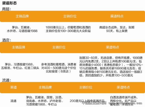 一是產品質量標準需要符合香港標準。所以,需要先拿樣品報關,酒體、瓶子、外盒等都能通關方可進行銷售。二是銷售價格定位符合香港市場特點。香港白酒市場發育尚不成熟,兩極分化嚴重,且白酒度數大于29度的話,通關的時候要交100%的稅,所以才會出現茅臺在香港市場零售價要賣到2700~3500港元。三是包裝設計符合香港市場審美,文字信息為繁體,并且個別信息可考慮中英文同時使用。四是品牌概念需要可追溯,有證據。香港的管理機構和消費者比較理性、認真,對于一些標準和概念一是一、二是二,按照規則辦事。