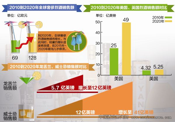 市場研究機構歐睿國際(Euromonitor International)發布的報告稱,2010年~2020年,全球奢侈烈酒銷售額將增長近一倍。