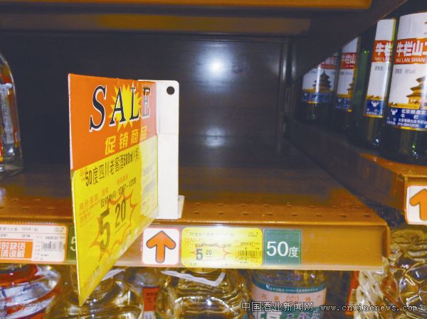 記者在煙臺某家超市的酒水區(qū)停留了十幾分鐘,一款名為“四川老窖”的白酒,因為其5.2元/瓶的超低價很快就銷售完了,一位消費者一次就購買了6瓶。他告訴記者,像他這個歲數(shù)的老年人平常都愛喝點小酒,但是現(xiàn)在經(jīng)常喝的幾款酒價格都有所調(diào)整,正在考慮換其他的品牌嘗嘗。而另外一款9元/瓶的四川綿竹大曲的貨架上早就標出了“貨已售罄”的字樣。