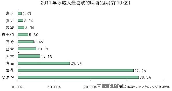 調(diào)查顯示,哈爾濱消費(fèi)者傾向于消費(fèi)的啤酒品牌排名與2010年沒有明顯變化,主要集中在哈爾濱啤酒、雪花啤酒、青島啤酒和燕京啤酒這四個(gè)品牌上。在2011年的消費(fèi)中,哈爾濱啤酒和雪花啤酒獨(dú)占大局表現(xiàn)明顯。從數(shù)據(jù)上來看,消費(fèi)者對雪花啤酒的提及率已經(jīng)從2010年的62.7%上升到2011年的63.6%,而哈爾濱啤酒的提及率則有所下降,從2010年的71.7%下降到2011年的66.5%,雪花啤酒與哈爾濱啤酒幾乎平分秋色。