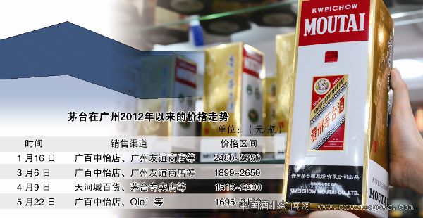 作為白酒漲價風向標的茅臺今年提價放緩,5月提高茅臺(均指53度飛天茅臺)出廠價的消息至今尚未正式兌現,這使得其終端售價繼續回調。5月22日,筆者走訪廣州市場發現,有商家已將茅臺售價從3月初2650元/瓶的高位,調至現在的2180元/瓶。此外,跌價還蔓延至了五糧液(均指52度),不僅終端價跌回指導價1109元/瓶,而且一級批發價也降逾200元。