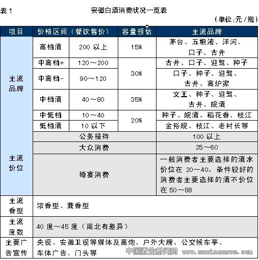 從安徽白酒市場品牌格局來看,徽酒的結構比較清晰,從5元/瓶~200元/瓶的價格帶上都有主力品牌。為避開彼此間的惡性競爭,安徽各白酒品牌清晰占據著相對獨立的價格帶空間,每個品牌都有自身的主導價格帶,并且在這個價格帶上穩居市場第一位。