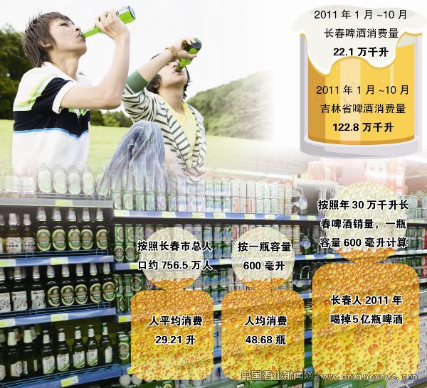 日前,蘇賽特商業數據有限公司東北三省2011年前10個月的啤酒消費量統計數據顯示:前10個月,吉林省為122.8萬千升,其中長春市消費掉22.1萬千升。為此,有業內人士預計,去年全年長春市啤酒銷量已經超過30萬千升。