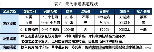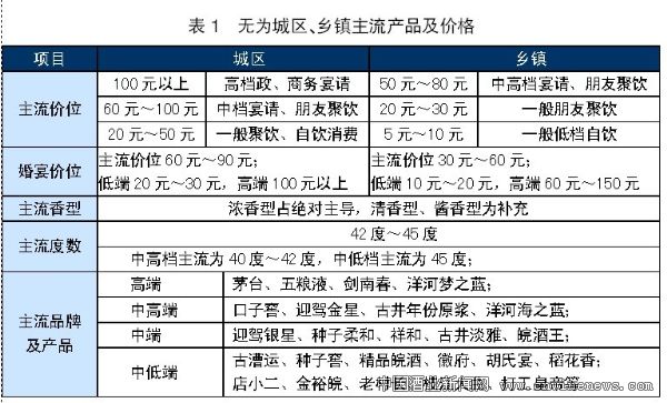 無為地區白酒消費能力普遍較強:飲酒風氣濃厚,部分區域女性喝酒現象也較普遍,且該地區勸人喝酒現象很嚴重。粗略估計,無為地區白酒市場容量約為3億元。因此,徽酒各品牌都集中兵力進攻該市場。無為城區、鄉鎮主流產品及價格(見表1),無為市場渠道現狀(見表2)。