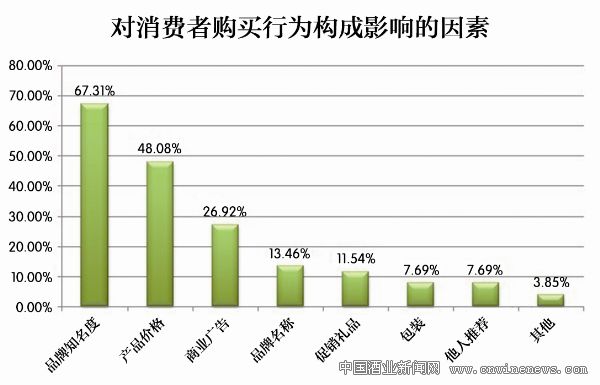 消費者購買酒類產品時最看重哪些因素?哪些因素又對其購買行為構成影響力呢?調查顯示,67.31%的人群選擇的是品牌知名度;價格也是消費者關注的重點因素,占比48.08%;商業廣告是第三大因素,占比26.92%;促銷、包裝、他人推薦等因素也對消費者構成一定的影響。