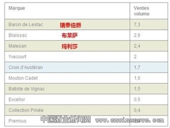 日前,法國著名酒水類專業雜志《Rayon Boissons》發布的一份關于“2012年8月至2013年8月波爾多產區紅葡萄酒在全法國超市銷售情況”的報告給出了答案。報告顯示:備受法國人青睞的紅葡萄酒品牌前三名依次為瑞泰伯爵(Baron de Lestac)、布萊薩(Blaissac)和瑪利莎(Malesan)。而這前三甲,均為歐洲最大的葡萄酒企業法國卡思黛樂(CASTEL)旗下的葡萄酒品牌。