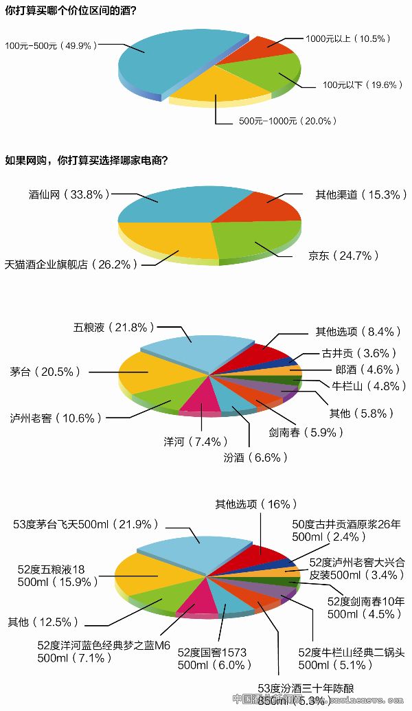 在價格的選擇上,新浪網“送父親什么酒”的問卷調查中,針對網友“你打算買哪個價位區間的白酒”問題時,更多的人選擇中檔酒。有49.1%的網友表示,100~500元之間的價格為首選。20.9%的網友選擇了500~1000元這個價格區間,此外,有18.7%的網友選擇了“100元以下”,只有11.3%的網友選擇了1000元以上。