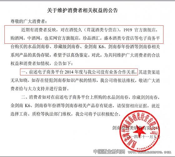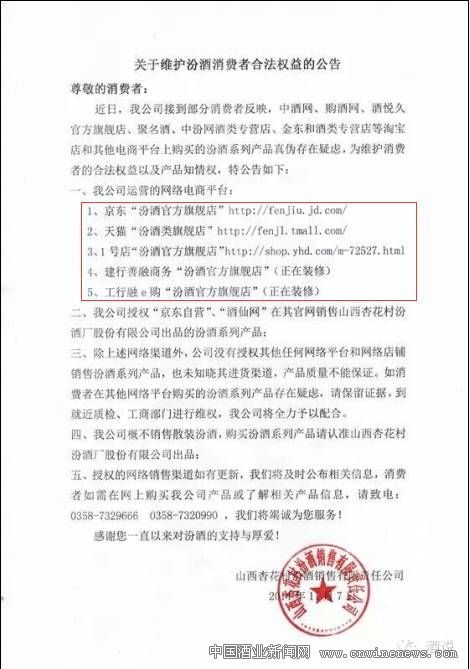 從五糧液、汾酒發布的公告中可知:五糧液、汾酒的電商指定銷售渠道目前只有京東等少數電商平臺,并沒有購酒網、茸晟酒類專營店等電商平臺。