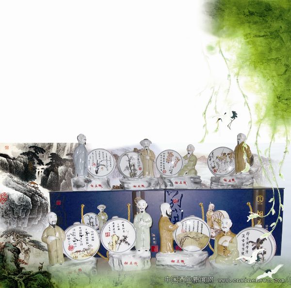 紀念瓶主體選用人物雕塑,按照中國畫的風格、根據歷史資料締造個性人物,造型古樸大方,栩栩如生,形態各異。酒瓶一套共8個,每個長17厘米,寬9厘米,高22厘米。每個人物旁邊配以一塊圓形的屏風,上有各位畫家的代表畫及書法,屏風背面是人文章來源華夏酒報物的簡介,三位一體,相得益彰,每個酒瓶正面底座部位都有“煙花醉酒”字樣,背面都有香型、執行標準、質量等級、配料、生產許可證號、酒精度、凈含量500ml、生產日期、產地、地址、電話及廠名等,酒瓶底部有“景德鎮制”及“珍藏限量版”字樣。