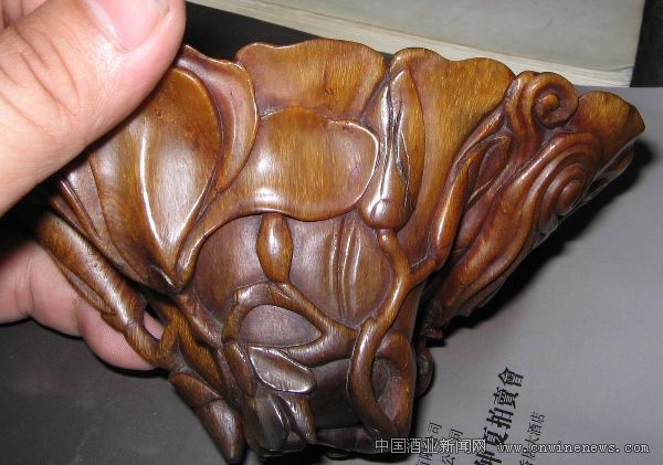 中國的酒文化源遠流長,作為中國傳統酒具中最為珍貴的一種,犀角杯曾在歷史上風光無限。如今,這種歷朝歷代為帝王將相所喜愛的酒具雖已失去其實用價值,但其收藏價值卻在日益高漲。特別是近幾年犀角杯屢屢在拍場上創造出天價傳奇,使得藏家紛紛追捧。本次萬達春拍征集到一件明代犀角杯精品,此杯口徑17cm,高9.5cm,底長7cm,為深棕色。器口橢圓形,外壁透雕玉蘭花枝,渾重蒼黝,古色古香,整個器物形似在花繁葉茂的玉蘭枝干上托出一朵盛開的大玉蘭花,器口呈橢圓形,雕玉蘭花瓣,花瓣自然伸展成杯口,以供飲酒用。透雕玉蘭花枝葉覆于杯之外壁,花枝纏繞上趴在杯口。整只犀角杯,從杯口至杯底自然減小,頭重腳輕,不能立穩,這也正是犀角杯奧妙之所在。滿酒后,由于不能平放在桌上,只能杯不離手,這樣更能使飲酒者盡興。此杯造型莊重典雅,因材施技,靜中有動,動中寓情,充分顯示了明代制犀藝人高超的技藝,它同北京故宮博物院所藏的一件玉蘭花式杯,無論造型還是雕刻技法,均有異曲同工之妙,是一件難得的藝術珍寶,值得著力關注。