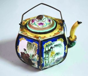這件精致的景泰藍制品是個提梁酒壺,器身呈六瓣瓜棱形狀,高11厘米,肩寬8厘米,壺口口徑6厘米。壺肩上6只黃色蝙蝠圍成一圈,壺蓋上回字圈紋內用黃藍相間的如意連枝串著4朵盛開的牡丹。6個壺面中,有5個面上的圖案都是藍底仕女圖,畫工精致巧妙,人物、環境惟妙惟肖;還有1個面上鑲嵌著象鼻形壺嘴,倒置此壺,壺嘴呈現大象面部形狀,象鼻、象牙盡收眼底。