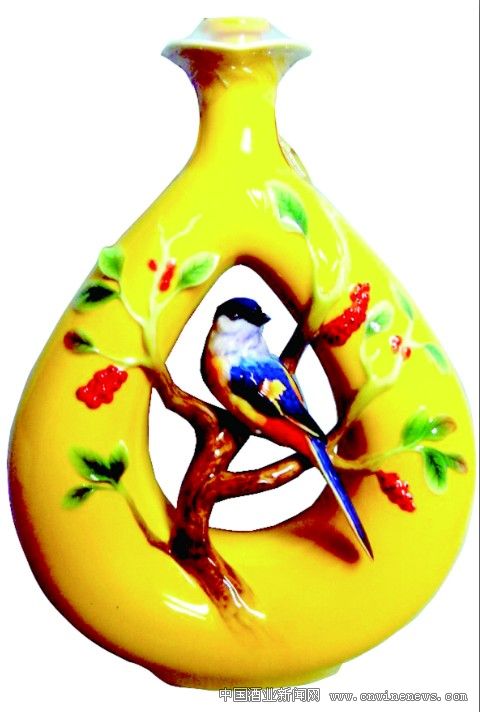 酒瓶設計師根據灰喉山椒鳥的習性,在花瓶的鏤空部位,設計了一棵2厘米粗的樹干,往上又分出3個小枝,枝上長滿了大片的綠葉、結著一串串紅色的小果子,這些果葉采用浮雕、捏貼等技術固定在瓶身上,映襯著黃色的瓶身,顯得格外耀眼。在第三個小枝上,棲息著一只美麗小巧玲瓏的灰喉山椒鳥,鳥從頭到尾長11厘米,雙爪緊抓住樹枝,羽毛層次分明、漂亮且富有光澤,頭頂、前額和背、嘴、眼為黑色,頸部羽毛為灰色,腿、爪也為淺灰色,腹、背、尾下部羽毛為橙紅色、雙翅、尾上為藍色,一只鳥兒身上有這么多斑斕的色彩,甚為美麗。鳥兒羽毛形象逼真,如頸部灰色羽毛,顯得松蓬、柔軟有起伏,背上的羽毛,可分得出一片片平行疊起,呈現出動感、立體之美。看這鳥兒悠然自在側身回望,恰似“回眸一鳴動四方”,吸引了無數酒客。灰喉山椒鳥的啼鳴很有特色,叫聲尖細,其音似“咻咻——咻”或“咻——咻”,第一音節緩慢、單調而長,隨之發出急促的短音或雙音,看著這尊美麗的灰喉山椒鳥,我想象著幾十只鳥兒在森林里鳴叫,奏響了一曲恢宏的交響樂。酒瓶構思奇妙,意境逼真,立體造型,色彩斑斕,雕琢精細,神韻盡出,使人感到時尚、獨特、自然、親切。
