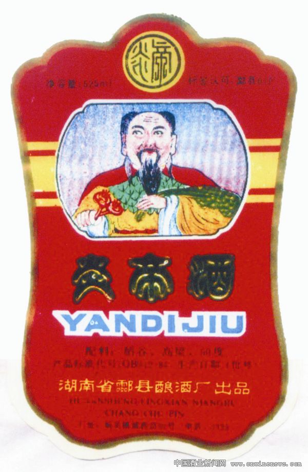 這是一枚“炎帝牌”酒標(biāo)。酒標(biāo)主圖是炎帝頭像,炎帝面容慈祥,目光炯炯,手持靈芝稻穗,有一種吉祥幸福的美感。“炎帝酒”三字為美術(shù)體。商標(biāo)也是“炎帝”二字,整枚商標(biāo)紅色作底,色彩艷麗。這是一枚早期酒標(biāo),為湖南省酃縣酒廠出品。酃縣,炎帝陵寢所在地,1994年5月,國務(wù)院批準(zhǔn)將酃縣改為炎陵縣。此酒已有幾十年歷史了。