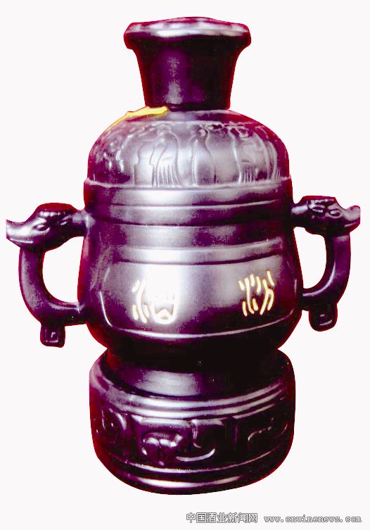此瓶整體高23厘米,其中瓶身高14厘米,蓋高4厘米,底座高5厘米,我把它稱作雙牛頭耳黑陶汾酒瓶。瓶身體圓,周長39厘米,豐肩,上部以兩耳為中心,兩邊各刻有浮雕,顯現的是制酒的流程和古人勞動的各種姿態。中部正面是“汾酒”兩個大凹字的金色隸書,背后是杜牧詩“借問酒家何處有,牧童遙指杏花村”,凹字描金篆書,這是仿古銅鼎銘文的藝術手法。兩側牛頭耳體量的長寬與瓶身協調,也與詩句一致,暗含牧童騎在牛背上給路人遙指杏花村的情景。蓋頂端一圈環繞有浮雕的片片花瓣,中間是一個牧童騎牛的形象,栩栩如生。底座的材料與瓶身完全一致,上下沿口內向,中間環繞仿古回形浮雕圖案,與瓶身整體感很強,瓶身經這美座相托,更顯莊重、古樸、大氣、典雅。瓶底凹刻有“山西杏花村汾酒廠股份有限公司出品”“傳世佳釀48°千秋汾酒”的正楷字。據了解,該酒系2001年出品,大概是為紀念新千年而作,生產批量不大,是千年黑陶與千年汾酒的完美結合,也是古老陶文化與現代酒文化的完美展現。據了解,黑陶瓶盛酒,對酒有老熟的作用,這酒要是喝起來,一定夠味。這瓶酒是一位朋友2002年出差從山西帶回來的,至今9年整了,我一直收藏著。這也是我所藏酒中,唯一的一瓶黑陶瓶酒,是我所藏陶瓷藝術酒瓶中的一朵奇葩。