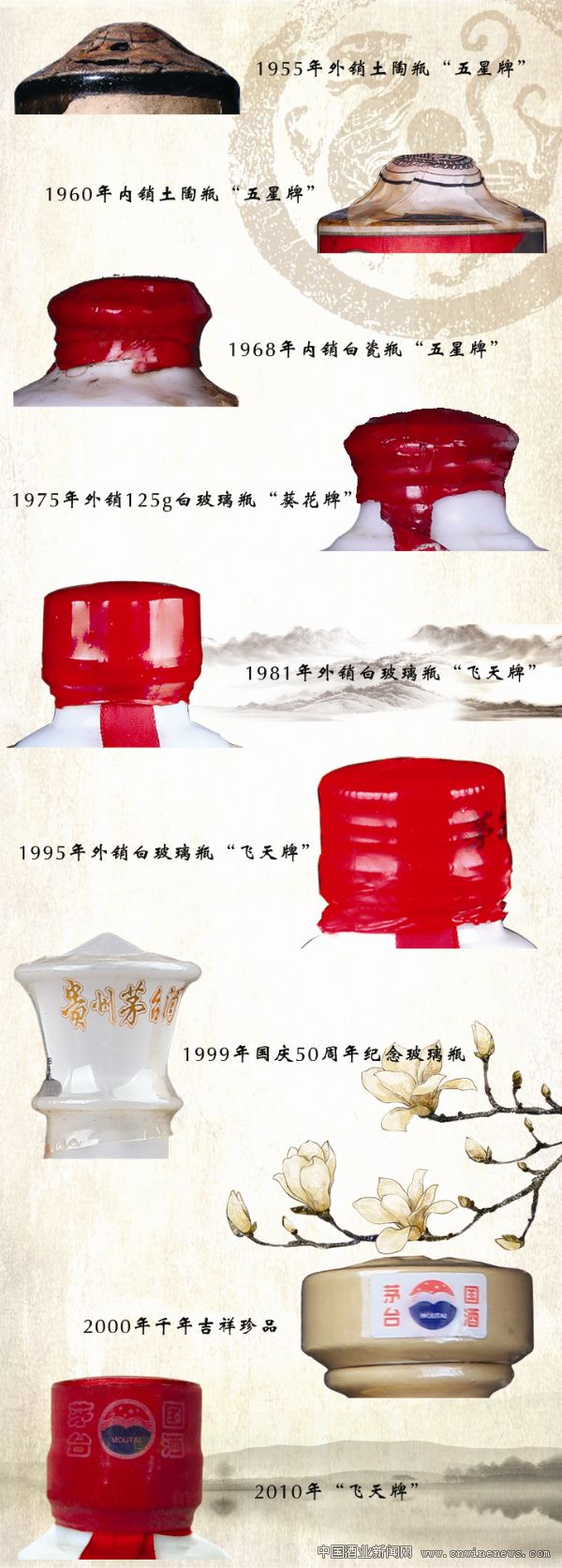 茅臺(tái)酒的封口歷經(jīng)百年滄桑巨變,從早期的瓶塞純粹的實(shí)用性,到如今的具有裝飾性和一定科學(xué)技術(shù)含量的瓶蓋設(shè)計(jì),其中飽含了多少茅臺(tái)酒人的辛勤勞動(dòng)和智慧的結(jié)晶,令人尊敬。