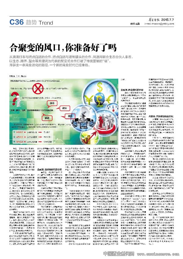 6月初,滴滴打車與國內互聯網白酒品牌燃點合作;6月25日,以“合聚變”為主題的樂視網酒網生態合伙人論壇在北京舉行,同期,燃點還宣布與國內搖滾樂隊液氧罐頭合作。悄然間,一股以“合聚變”引發的跨界合作新潮流正在襲來。在互聯網的催化下,這種風潮帶給傳統酒業新的思考。