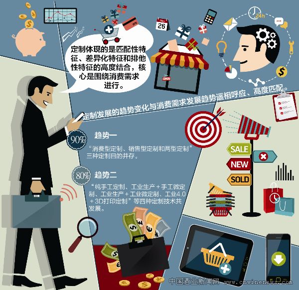 由于酒水業、服務業過度強調工業化、流程化生產,致使產品形態高度雷同、產能快速過剩;消費者在基本需求得到有效滿足后,傳統的雷同化產品很難再度激發消費興趣,與之相反,即使是停留在表面的“一瓶定制”和選擇性的“服務定制”,都獲得了眾人的青睞。
