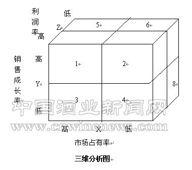 一種分析產品組合是否健全、平衡的方法稱為三維分析圖。在三維空間坐標上,以x、y\x三個坐標軸分別表示市場占有率、銷售成長率以及利潤率,每一個坐標軸又為高、低兩段,這樣就能得到八種可能的位置。如三維分析圖所示: