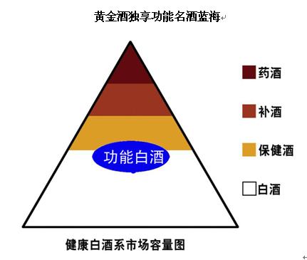 功能白酒這一藍海市場,是介于保健酒和白酒之間的市場,它的市場容量要遠超過保健酒目前百億元的市場容量。黃金酒在產品研發上,解決了傳統保健酒藥味太濃的產品缺陷,口感與五糧液的白酒基本一樣,既滿足了百姓喝白酒的口感享受,又滿足了對健康的需求。因此,黃金酒在未來市場中將受到中老年人的青睞。