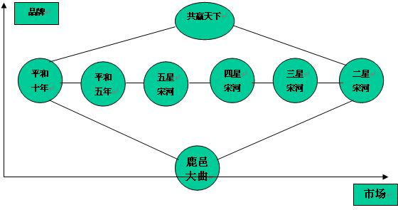 河南宋河在廣告公司與咨詢公司推波助瀾下,已經是扎扎實實地成為一個多核心品牌白酒企業。目前,宋河著力培養的主要有共贏天下,宋河糧液,鹿邑大曲三個核心戰略型品牌,這三個核心品牌無論是產品命名上,還是品牌定位上,抑或是市場定位上都完全獨立的。并且,在核心品牌均形成產品系列。這三個品牌也是完全不同的。其中共贏天下---作為宋河酒業超高端核心品牌產品數量上比較少,形成的產品具備點狀特征;鹿邑大曲---作為宋河酒業相對低端核心品牌,產品數量上也比較少,構成點狀特征;而宋河糧液----作為宋河酒業核心中檔品牌,產品數量眾多,三個核心品牌構成了菱形面。