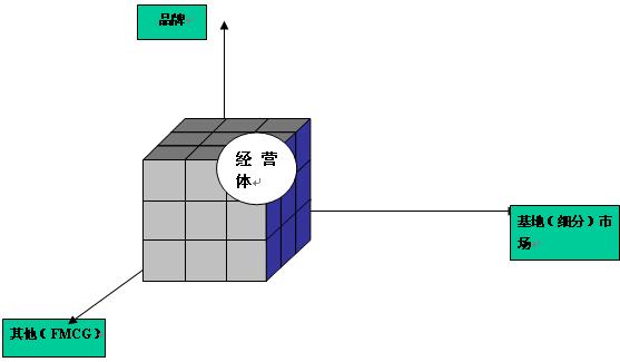 以品牌為導向相關多元化立體戰略成敗關鍵取決于四個核心要素:品牌戰略,基地(細分)市場,產業關聯度以及經營主體,如下圖所構建的相關多元化立體戰略模型簡圖。