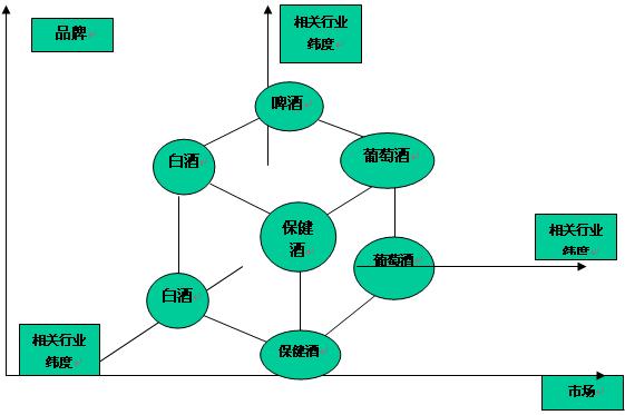 而白酒企業進入相關多元化首先選擇的往往是酒水行業,為此,我們借助三維空間,構建了特定的立體模型:在行業緯度上,果酒(葡萄酒),保健酒,啤酒,白酒形成了四個行業緯度。