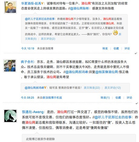 本為“搶購”成功而興奮不已的這位網友接到這樣的電話自然是大失所望,并且對酒仙網的“出爾反爾”大為不滿,于是在微博上給酒仙網的多位領導反應此事。酒仙網董事副總裁@楊國峰酒仙網 和酒仙網董事長@酒仙網郝鴻峰 均在第一時間給予了回復。酒仙網副總裁楊國峰發微博針對網站系統錯誤問題向廣大網友致歉,表示會按“0”元價格給網友發貨,并留下了自己的手機聯系方式;酒仙網董事長郝鴻峰在微博回復稱,“錢可丟,晉商信譽不可失”,也表示會按“0”元價格為網友發貨。