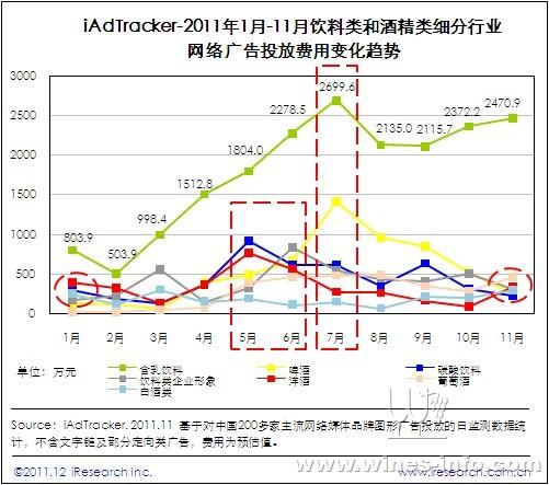 iResearch艾瑞咨詢根據(jù)網(wǎng)絡(luò)廣告監(jiān)測系統(tǒng)iAdTracker的最新數(shù)據(jù)研究發(fā)現(xiàn),在社會消費品零售總額穩(wěn)步提高的背景下,食品飲料類2011年1-11月的廣告投入同比穩(wěn)定增長至 10.5億,較去年同期增加24.1%。其中,由于飲料產(chǎn)品的季節(jié)性需求,其廣告投放相對集中于夏季。而除啤酒外的酒類年末和春節(jié)營銷意愿較強。媒體類別選擇上,食品、飲料和酒精類產(chǎn)品媒體選擇各有側(cè)重,酒類產(chǎn)品對于男性群體聚集網(wǎng)站的廣告投入把握恰當。