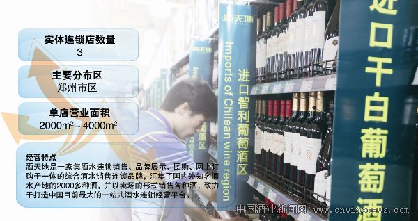 就在酒便利、大河酒城快速裂變的同時,又一家大型連鎖酒類超市——酒天地在鄭州市場上再度掀起酒類流通波瀾。2011年9月6日,由河南酒天地商貿有限公司操盤的酒天地第一家店在鄭汴路開業,該店經營面積近4000平方米,不僅在河南省,在國內市場也是首屈一指的專業銷售酒水的大賣場。