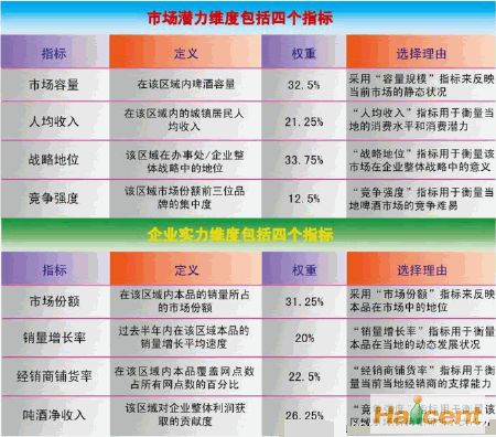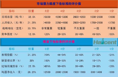 結合企業的銷售狀況和我們的啤酒營銷知識庫,對區域市場評估的判斷可基于以下兩個維度的交叉分析:市場潛力,即特定目標市場的發展現狀和潛力;企業實力,即本企業在特定市場上的資源支持和競爭優勢。兩個維度的交叉組合可以組成九種市場空間,并依此來確定公司的營銷策略和資源投入方向確定評價因素及每個因素權重(權重由專家團評分給出)。市場潛力和企業實力的評價指標沒有通用標準,必須根據企業所處的行業特點和企業發展階段、行業競爭狀況進行確定。上表是我們根據多年行業研究經驗,針對中等以上規模企業或企業集團設定評估標準。其中,各項指標的的設定是基于市場競爭活動為出發點,不包含GE矩陣中復雜的人力、生產、供應等因素,力求做到簡單直接。評估指標中,多為企業營銷戰略回顧中的常用指標,以定量指標為主,定性指標為輔,從而將企業的常規營銷戰略回顧建立在一個系統分析的模型之下,成為每年兩次的營銷戰略會中的重要管理工具。