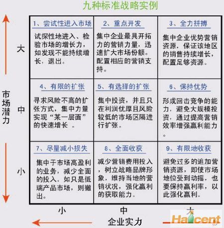 當然,九種標準戰略只能是區域戰略規劃的方向,企業在具體實施區域戰略規劃的時候,還需要進一步的定位,才能更好地管理戰略。為此,我們將戰略定位確立為三個類型:戰略壟斷/鞏固市場、戰略發展/鞏固市場及戰略進入市場。一般來說,戰略壟斷/鞏固市場包含于三、六、九象限區域市場中;戰略發展/提升市場包含于一、二、四、五象限區域中。而戰略進入市場的選擇必須考慮在市場潛力中等級以上的市場,根據可調配的企業資源和市場機會進行選擇。最后,第七、八象限區域的市場,通常是戰略撤出或保留市場,具體定位確定后,將不納入我們的戰略規劃范疇。