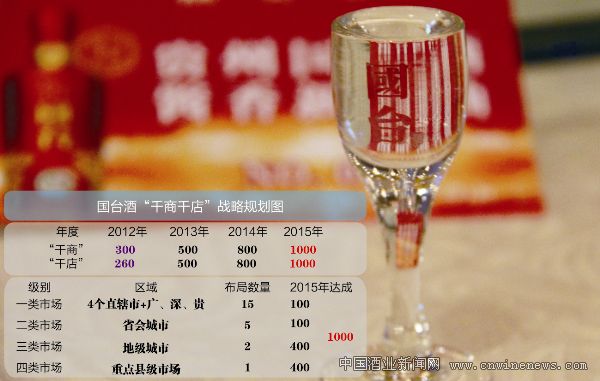 19個月之后,在今年的福州全國秋季糖酒會上,國臺酒業正式啟動“千商千店”戰略,計劃到2015年,在全國市場發展1000家優質、良性、強勢、戰略合作的國臺酒一級經銷商,建成1000家按照“六個統一”標準建立的國臺酒專賣店、旗艦店。