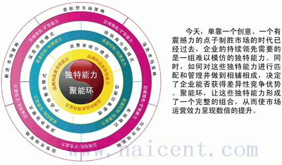 任何一種能力都不能獨立地確保成就領先的市場地位。如果銷售、營銷、財務和供應鏈這些基礎功能不是特別強有力的話,任何一種能力的有效性將會大打折扣。但這也并不是說所有領先企業在這三種能力上勢均力敵,只不過對于每種能力,他們都有一套無可復制的專長和屬性。而這,正是成就領先地位不可或缺的。更重要的是,這三種能力并非獨立存在的,它們需要一個系統的整合、配稱。聚能環將這三種能力統合在一個戰略目標之下,在統一的“號令”中聚合巨大的市場能量,實現規?;\營。