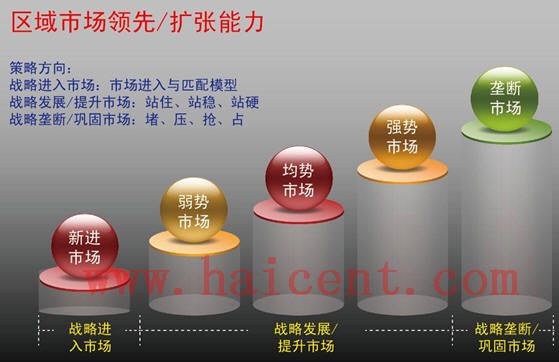 長期以來,人們總是會混淆“戰略”和“策略”的定義,將戰略等同于策略。戰略乃取勝之道——“戰略可以定義為確立企業的根本長期目標并為實現目標而采取必需的行動序列和資源配置”。而“策略”的定義常常包括以下幾個方面:a. 可以實現目標的方案集合; b. 根據形勢發展而制定的行動方針和斗爭方法;c. 有斗爭藝術,能注意方式方法;d. 計謀,謀略。e.在作當前決策時即將未來的決策考慮在內的一種計劃。簡而言之,戰略包括三個關鍵要素:目標、手段、資源;而策略就是手段,是利用既定資源實現既定目標的謀略。獨特能力所指的“能力”更多地是策略層面的事情。區域領先/擴張能力,是企業在不同類型市場的戰術手段,是一套完整、持續的市場計劃。它包括以下三個塊面: