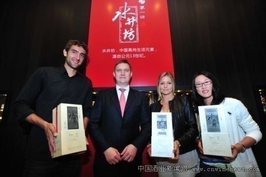圖注:2012年中國網球公開賽期間,國際網球明星基里連科、西里奇、鄭賽賽手持中網紀念酒在水井坊品牌館留念