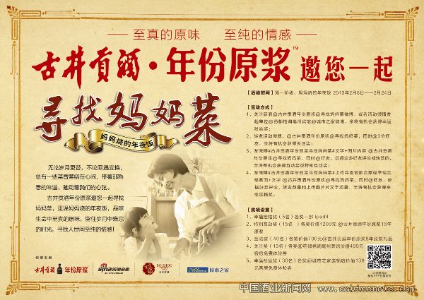 ③發微博#古井貢酒年份原漿尋找媽媽菜#“文字+圖片內容@古井貢酒年份原漿@尋找媽媽菜”,同時@好友,獲得眾多好友評論或轉發的,親將有機會獲得互動獎或特別互動獎;
