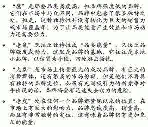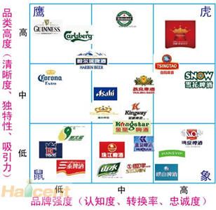 利用品類高度/品牌強度分析圖,從全局上描繪了一品牌的成長軌跡和競爭格局。大多數的品牌,即便是全國性的知名啤酒品牌,就某一個具體的市場而言,都是從小品牌和較低的市場覆蓋率起步的。在這一階段,品牌的注意力集中在使得品牌更為獨特上:增加它的品類能量。然后在某一時刻,與日俱增的能量轉化為市場的影響力,也就是品牌強度:品牌會變得更加大眾化,更多的人購買它,而且會更多頻次地購買。品牌的覆蓋率會變得更加廣泛,在這個階段,品牌的注意力就變成了將品牌的影響力轉化為銷量的快速增長。再然后,就會迎來巨大的挑戰。理想狀況當然是成為一只既有高品類能量又有高品牌強度的“老虎”,但是在現實中,只有極少的品牌能達到這個理想的位置,它們會在大眾化和獨特性面臨兩難選擇。一個品牌在最初往往是為少數人“量身定做”而得到擁戴的,隨著品類吸引力的增強,市場覆蓋也就在不斷增大了,但覆蓋率的增大往往會削弱品牌的獨特性。所以,一個品牌很難做到滿足所有消費群體,要想培育一只“老虎”,關鍵就是要為品牌的市場定位選擇一個明確的方向。與中國啤酒品牌價值元素圖不同的是,前者是通過消費者調研和品牌傳播訴求來界定了品牌的定位方向,后者則是從品牌競爭格局的角度來進一步分析品牌在市場上的表現和實際地位。兩張圖的結合分析,能夠更好地洞見品牌在市場上差距和應該的發展軌跡。現今的啤酒市場上,堪稱“老虎”的可能僅有百威啤酒一只。一個美國本土的大眾品牌進入中國來一直以高端品牌形象為出發點,多年積累造就了其難以超越的品牌地位,自2003年以來一直保持著全國高端啤酒50%以上的份額,成為中國啤酒行業贏利最大啤酒企業。健力士黑啤是典型的“鷹”,一杯啤酒成為一小群人心目中頂禮膜拜的品牌,成為他們精神寄托的家園。在健力士啤酒的消費群體中,健力士啤酒的飲用變成了一種儀式,從酒杯選擇、倒酒到飲用都賦予了其獨特方式,盡管它最終只能成為少數品位人士的選擇,但在他們中間始終保持著極其崇高的地位。而對中國本土的啤酒品牌來說,定位不清、方向不明可能是存在的最大問題。一線軍團,正在努力從“大象”向“老虎”邁進,但在前行中可謂困難重重。青島啤酒,中國最有底蘊的大眾啤酒品牌,過于向高端和年輕化延伸而稀釋了品牌的價值,好在現在已經開始意識到了這個問題,以奧古特這個獨立品牌來經營其高端品牌印象。雪花啤酒,以資本為驅動的品牌整合,在過渡促銷的影響下,低端品牌的印象導致其始終未能走出“泥潭”,增強品類高度是其邁向“老虎”的關鍵所在。而燕京啤酒一直高舉振興民族工業大旗,追求所謂的科技創新,卻違背了啤酒品牌的基本屬性,品牌價值的模糊性就不言而喻了。另外,中國啤酒行業競爭階段和特性,決定了眾多的區域性、地方性的“大象”品牌,比如廣西的漓泉啤酒、內蒙的雪鹿啤酒、西安的漢斯啤酒等,在當地有著壟斷的市場地位,它可以通過促銷和渠道封鎖來贏得短期的競爭優勢。當一個資本雄厚、有全國性品牌背景的企業大舉進攻時,其壟斷地位將迅速被瓦解、甚至是消亡,四川藍劍啤酒就是典型的例子。對這些大象品牌來說,如何憑借品牌強度的優勢,為品牌注入更多的獨特性以提高品類高度,是保持和鞏固其市場地位的關鍵。