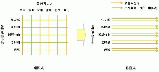 2013年1月,郎酒集團啟動了一場涉及到6000多人的營銷組織變革,將其“事業部+辦事處”的“矩陣式營銷組織結構”,變革成為以五大事業部垂直運作的“準公司制運營模式”。