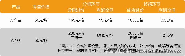 “倒掛式”價格體系設置,通過本品搭贈的方式,讓分銷商、終端等各渠道環節共享產品的溢價空間,使得原本不明顯的利潤空間優勢得到凸顯。