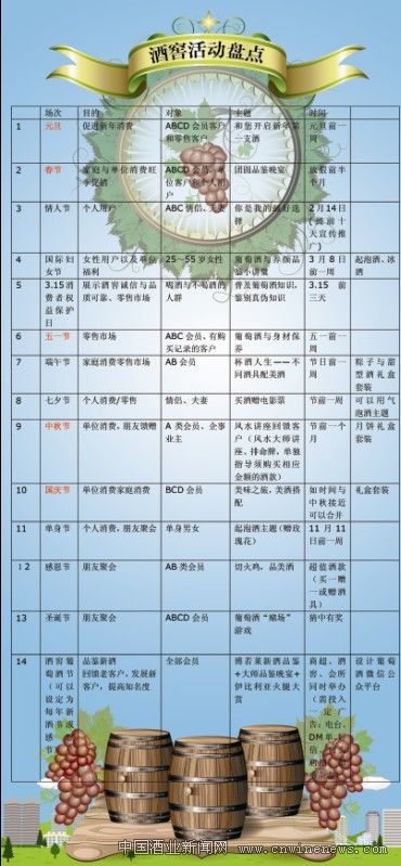 另外,經銷商還可以加入針對新品的小型品鑒活動,也可以把新品活動融入到這些各種節慶活動中。同時,也可以利用周六、周日下午相對空閑的時間舉辦“一瓶匯”,吸引愛好者人氣。