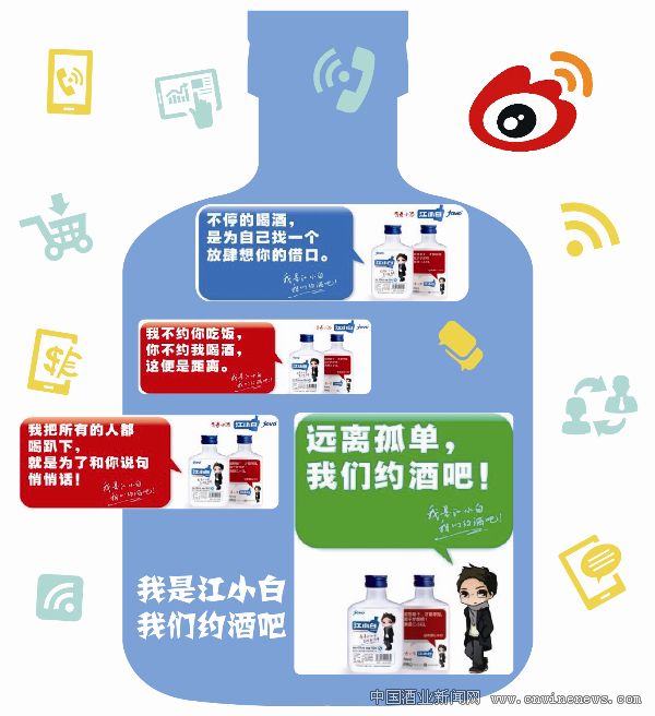 “我把所有的人都喝趴下,就是為了和你說句悄悄話”、“我不約你喝酒,你不約我吃飯,這便是距離”、“遠離孤單,我們約酒吧。”11月28日,重慶江小白酒類營銷有限公司CEO、江小白的創(chuàng)始人陶石泉在新浪重慶組織的2013重慶微博營銷大會上宣布,曾在業(yè)界產(chǎn)生傳奇營銷效果的江小白又有了新的行動。江小白正式啟動新一輪微營銷創(chuàng)意,“約酒”及“我們約酒吧”成為新活動創(chuàng)意的關(guān)鍵詞。