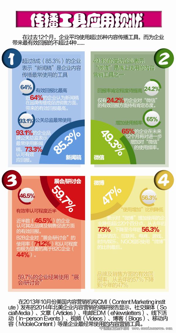 根據(jù)著名新聞通訊公司美通社《2014新媒體環(huán)境下企業(yè)內(nèi)容傳播趨勢(shì)與ROI效果評(píng)估》報(bào)告(以下簡稱“報(bào)告”)顯示,在過去的12個(gè)月中,企業(yè)平均使用超過6種內(nèi)容傳播工具,而為企業(yè)帶來最有效回報(bào)的不超過4種,新聞稿(85.3%)、網(wǎng)站(76.6%)、微博(73.5%)等,仍是企業(yè)最常使用的內(nèi)容傳播工具或手段。