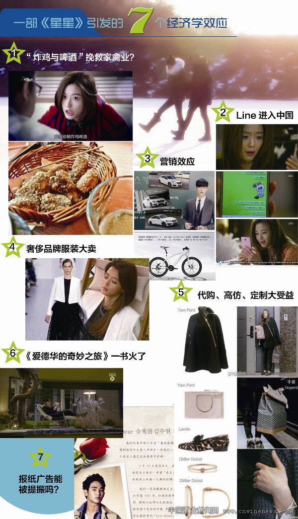 韓劇一向擅長引導市場消費潮流。長腿歐巴李敏鎬的中國撈金之旅還未結束,另一部韓劇《來自星星的你》便接過了市場風向標的大棒。從開播便以超過20%的收視率一路領跑,劇中人物的衣食住行也被粉絲和各路達人扒出來廣為傳播。衣服、鞋子、發飾、墨鏡、項鏈,甚至炸雞和啤酒都成了消費者追逐的熱點。