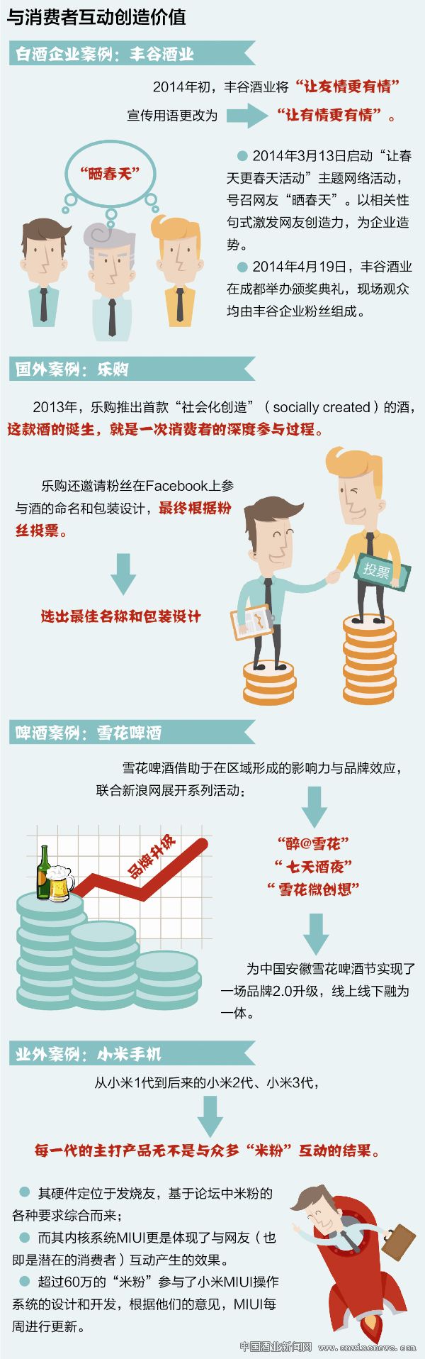 終于,在移動互聯網洶涌的2014年,看到諸多互聯網產品由于消費者參與設計、生產、銷售而大獲成功,傳統的白酒行業鼓起了嘗試的勇氣,萌生出與消費者互動創造價值的態勢。