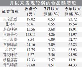 來自WIND的統計數據顯示,截至7月27日收盤,申萬食品飲料行業所屬46家上市公司總市值(證監會算法)為5481.62億元,較年初的3362.74億元增加2118.88億元,市值增長63.01%,板塊弱勢特征明顯。而7月以來,該板塊市值則增加553.86億元,市值增幅10.10%,同樣落后于大市。以大智慧釀酒食品指數計算,截至7月27日收盤,該行業指數73.73%的年內漲幅,則要落后滬綜指14.93個百分點,而與深成指111.91%的漲幅相比,落后幅度將更大。此外,7月以來該板塊12.06%的上漲幅度,同樣落后月內滬綜指上漲16.08%的表現。