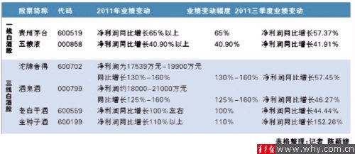 從已經披露年度業績預報的白酒上市公司來看,包括酒鬼酒 (000799)、沱牌舍得 (600702)和金種子酒 (600199)等在內的多只三線白酒股,其全年業績漲幅均超過了100%。其中,沱牌舍得預計2011年度凈利潤同比增長幅度為130%—160%;酒鬼酒去年全年凈利潤增幅預計達到125%—160%。此外,金種子酒和老白干酒 (600559)在2011年的業績漲幅也預計達到了110%和100%。與之相比,五糧液和貴州茅臺這些一線白酒股的業績增幅就顯得有些“后勁不足”了。